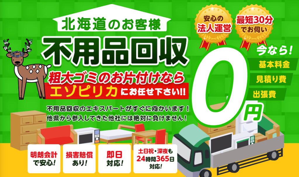 この記事では、札幌市近郊に対応の不用品回収業者『不用品回収のエゾピリカ』を詳しくご紹介します。